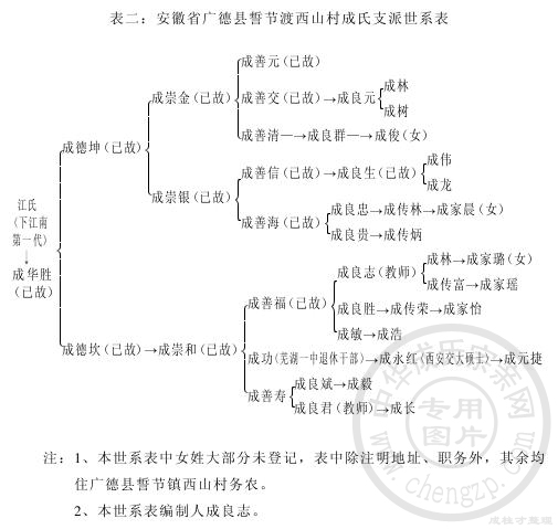 湖北阳新县成氏宗支范公之后,清末同来安徽广德的另有一支派,亦落户誓节渡西山村,他们由第一代汪氏携子华胜下江南传至今已有八代,现将此支派列名表二《安徽省广德县誓节渡西山村成氏支派世系表》,亦附后。